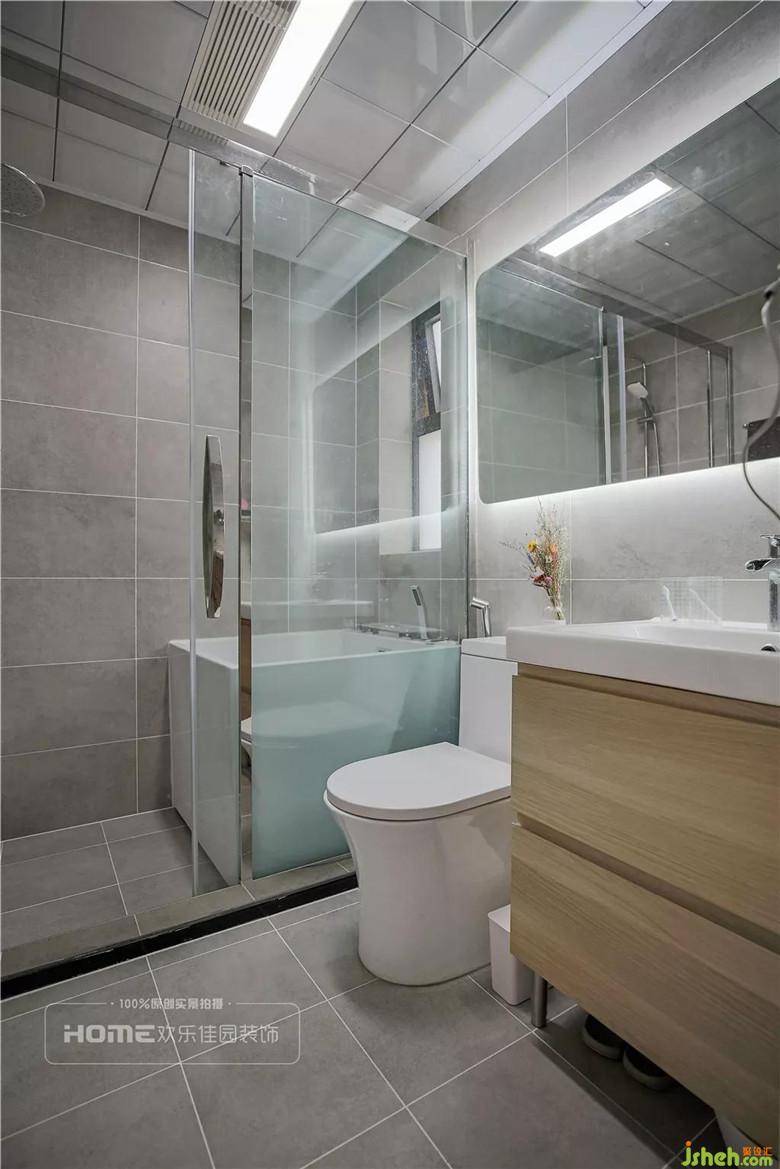 主卧自带的主卫,不是同一度的灰色以及不同色系的原木,风格与主卧大体一致,淋浴区与洗漱区分开,有效避免湿气入侵卧室,既保证住的人的健康也保障家具不受侵蚀。