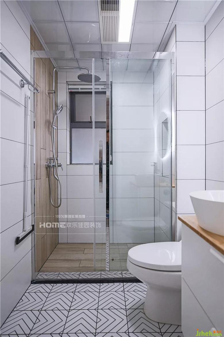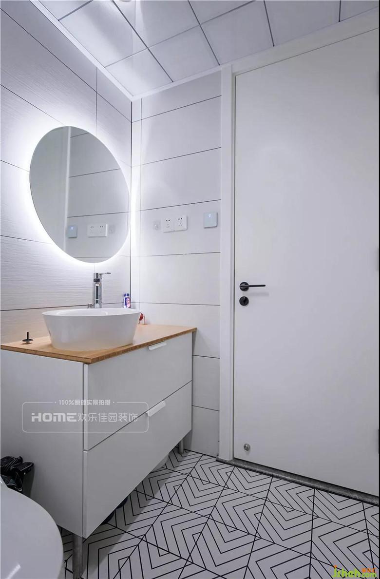 次卫的亮点设计是鱼骨纹地砖和自带特效的镜子。带有北欧风元素的地砖花式铺贴,主推鱼骨纹,地砖并行排列,线条的力度与次卫相配合;圆形的镜面,背面一圈的灯带,增加了空间的精致感受。