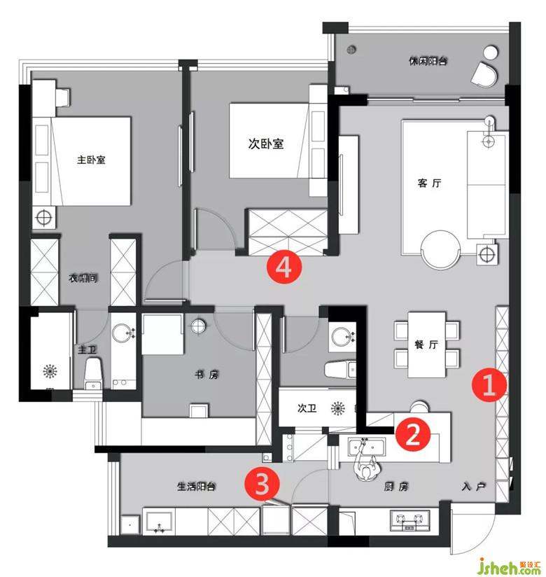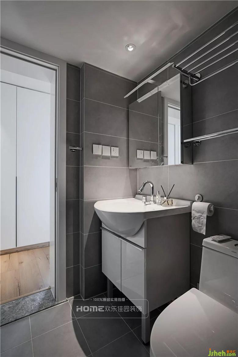 卫生间设计综合考虑洗漱、马桶、淋浴三种主要功能,灰白相间的搭配,耐脏与防滑并存,淋浴区加装玻璃隔断,在地面砌出门槛,防止水溢出,各功能互不影响,各司其职。