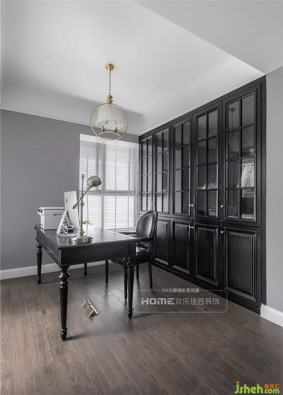 幽静的书房空间,出于业主对深色家具的偏爱,依旧选择黑色的书桌与书柜,浓重的色彩,简约的布置,嵌入式书柜设计凸显出主人的高雅与大气。
