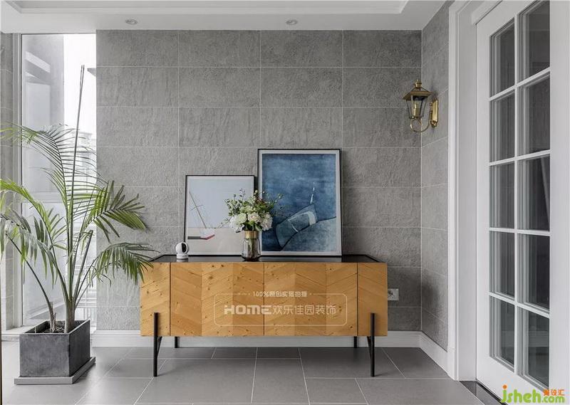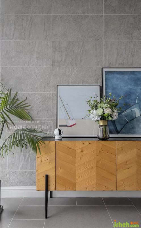 空间开阔又与众不同,铺贴水泥灰的地砖和墙砖,大气简洁,大面积的落地窗,引入自然光线,搭配不同色系的鱼骨拼端景柜,让人产生意想不到的视觉效果。