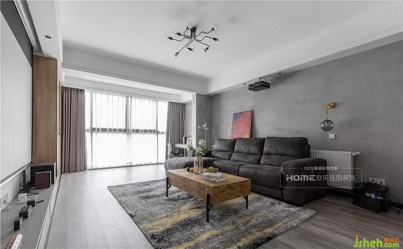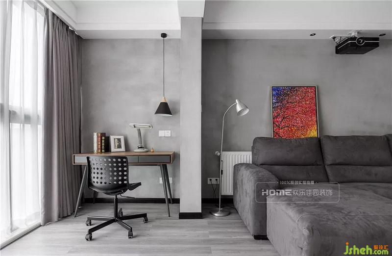 移步到客厅空间,设计师根据业主的要求,秉承着干净、明朗的理念,去掉墙面与顶面的复杂装饰,灰色水泥漆背景墙与黑色皮绒沙发相得映彰,为了缓和空间的沉闷气息,选择一幅暖色系挂画与原木色的茶几,在光源的应用上则以自然光为主。