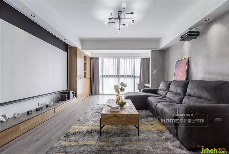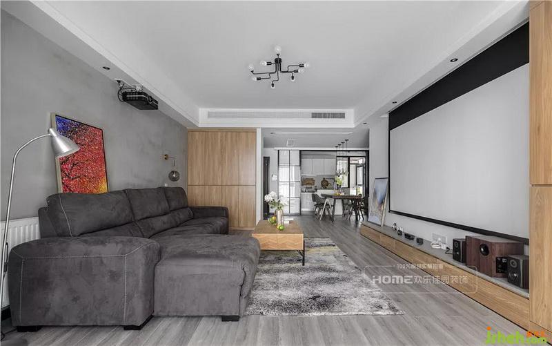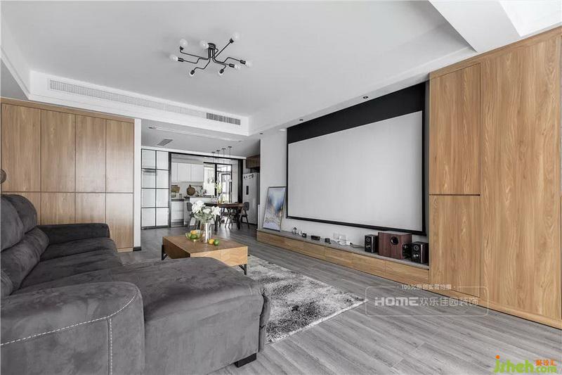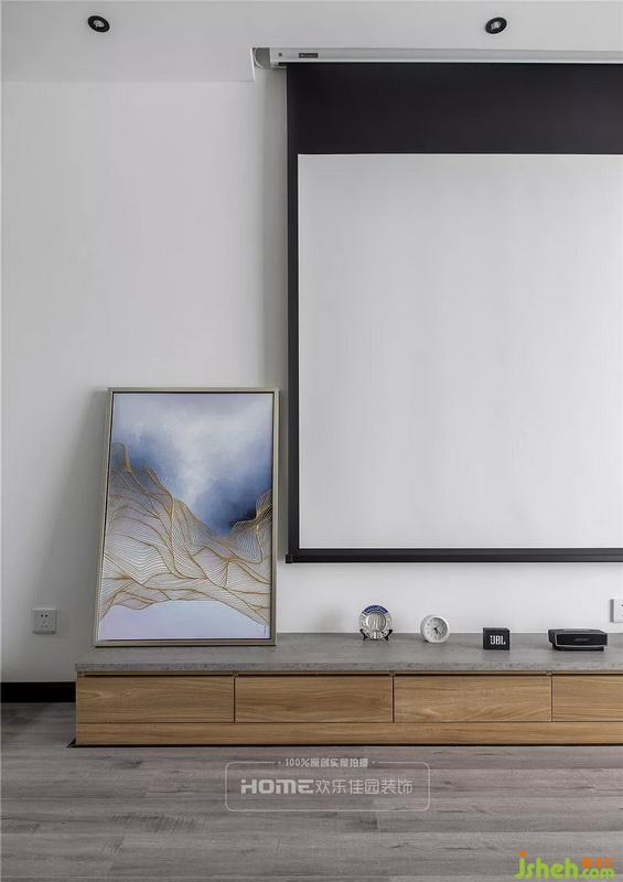 业主舍弃传统的电视和电视柜,用隐藏式的投影幕布代替,拥有极佳的休闲体验;定制的组合式连体柜,和沙发左侧的储物柜相互呼应,整体感连贯统一。