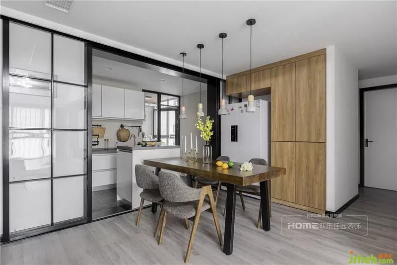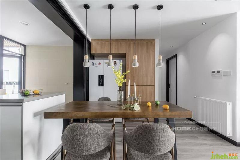开放式的餐桌与中岛相结合的设计,个性十足,一方面延伸了岛台的功能,一方面做到与家人之间的联络,把空间合理利用起来,增大家庭的互动与情感的交流。