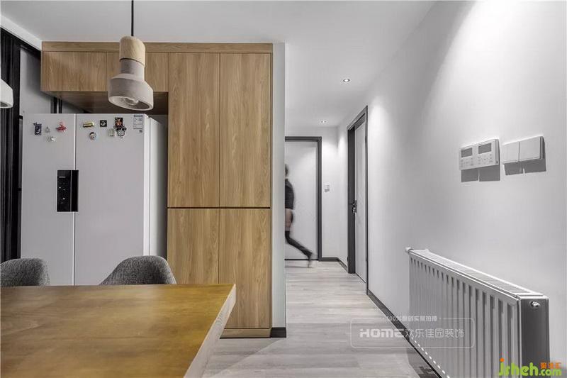 实木的餐桌搭配黑色铁艺的桌脚,再辅以灰色布艺餐椅组合,在自然的氛围下,木质与灰色奏出和谐的乐章,定制的餐边柜,预留冰箱摆放的尺寸,使空间产生撞色感,家具的自然过渡,简约的设计显得更加有家的味道。