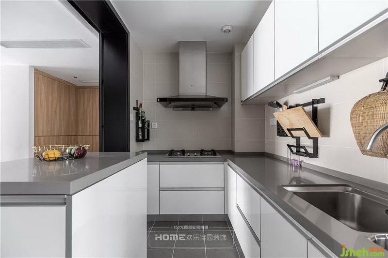 L型的橱柜布局,米色的墙砖与白色的橱柜相组合,搭配水泥灰的操作台面与地砖,缓解厨房空间的压抑感,整洁又耐脏。