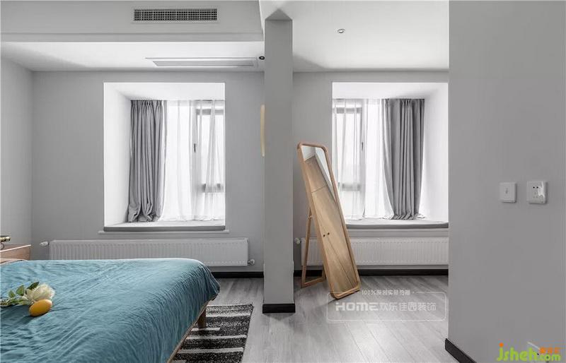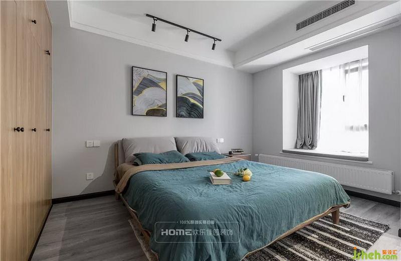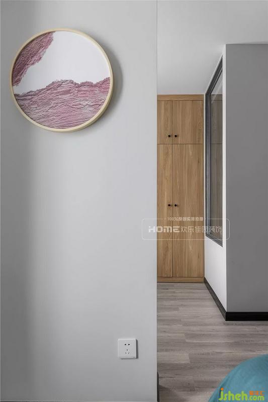 卧室铺贴浅色做旧地板,延续留白顶面和墙面,原木色的定制衣柜,提升空间机能,简约的线条勾勒出整个空间的轮廓,整个设计手法简单大气,面与面的高低错落,拉升空间的立体感。