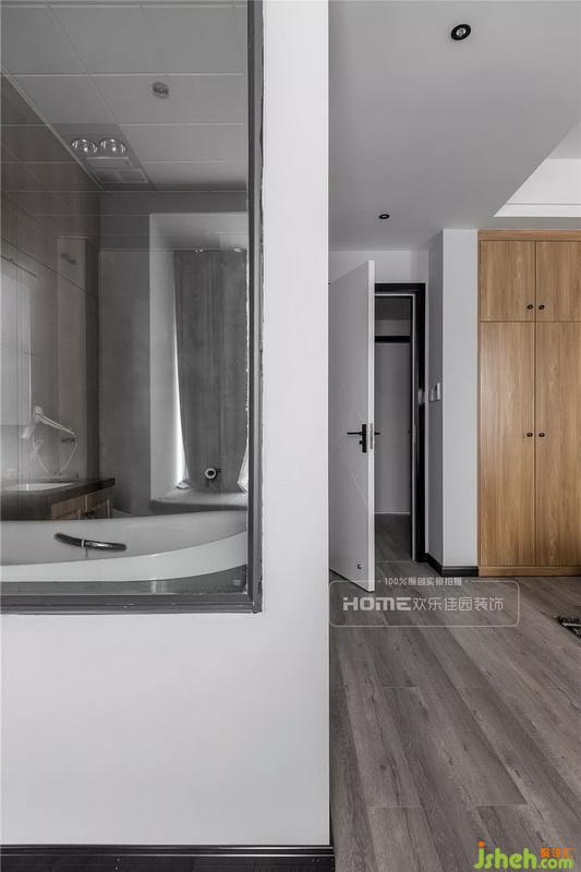 主卧由原户型的两个次卧打通合并形成,规划了衣帽间,并将卫生间和衣帽间之间的墙体改用玻璃代替,以此来保证卫生间的采光。