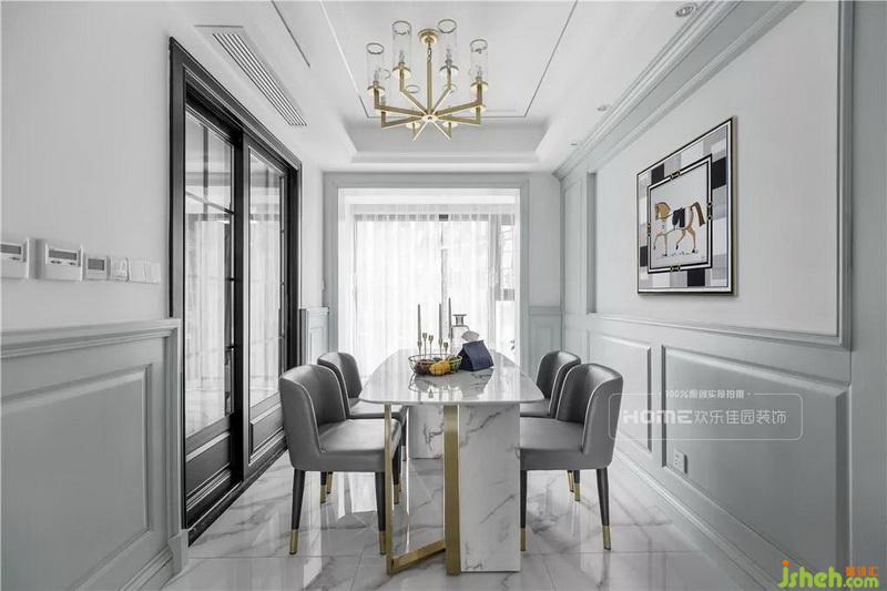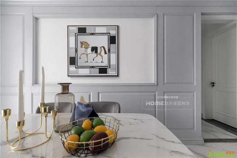 蓝灰色的木饰面板,预留挂画的操作空间,提升就餐档次,再通过软装的摆件点缀,丰富空间层次。