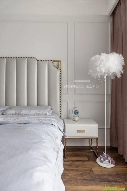脏粉色的窗帘以及朦胧光线投射下,栩栩如生,卧室的羽毛顶灯与床头的落地灯交相辉映,深色的地板和乳白色的吊顶,形成鲜明的对比,加深视觉的冲击感。
