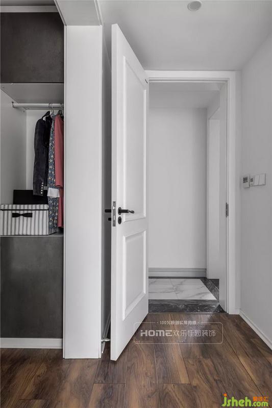室内设计师将主卧室与次卧室临门处墙体打通,把次卧室空间的一部分利用到主卧室来用作衣帽间,同时扩大主卧的使用面积和解决的次卧狭长的问题,一举两得。