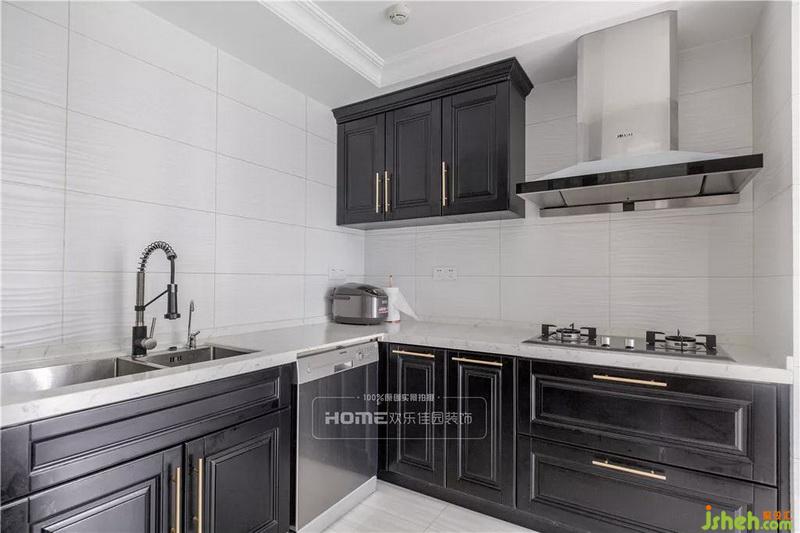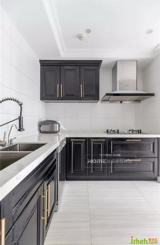黑色橱柜与素雅的台面使得厨房富有立体感,充足的储物柜将生活杂物规整,合理的动线包容生活中的烟火味。