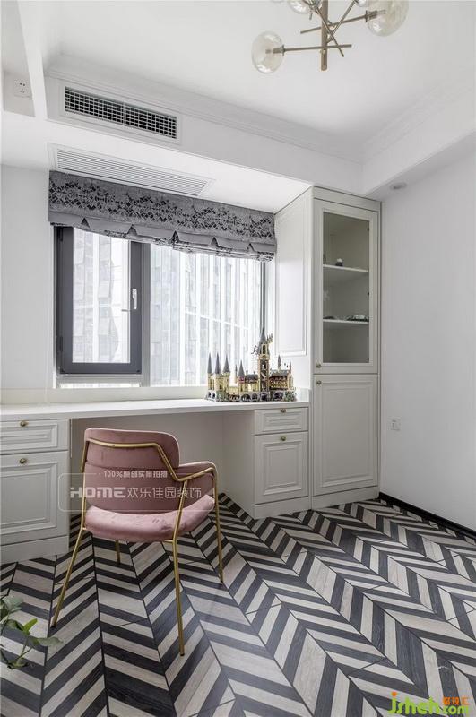 仿鱼骨拼地板,纹理自然,视觉冲击力十足,粉色丝绒单椅,腿部金属造型,奢华质感不言而喻,从而衍生出精致有序的生活气息。