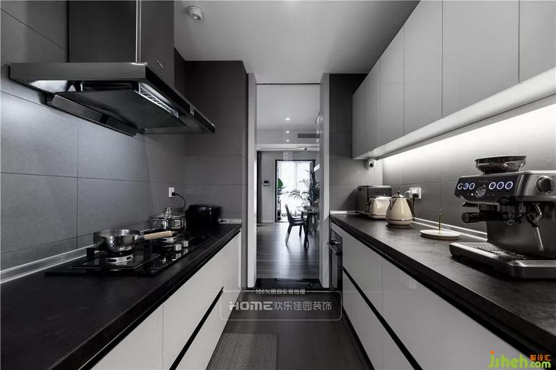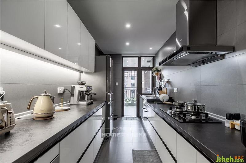 厨房空间大而宽敞,双一字型的布局,一边烹饪区,一边放置各种电器,上下两排的橱柜足够收纳他俩的生活需求。