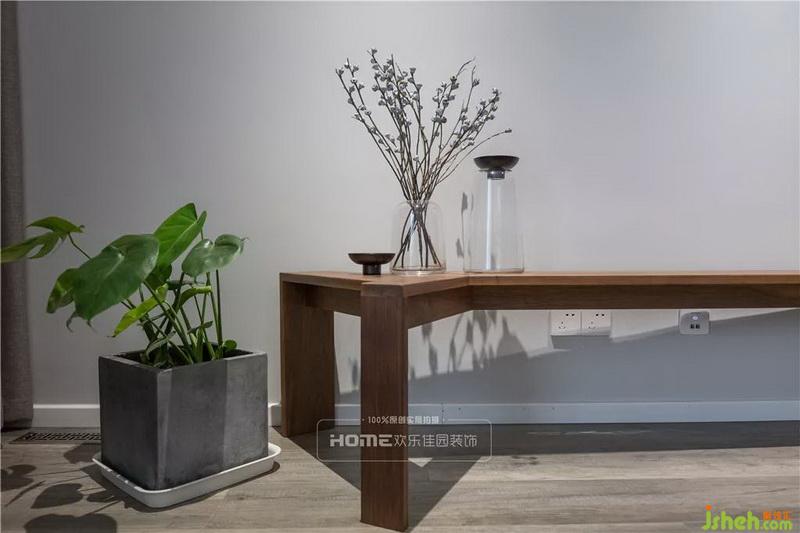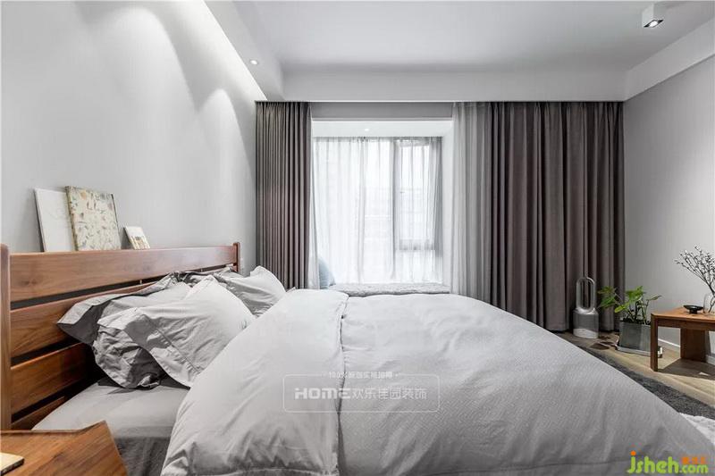 在飘窗上铺满一整块毛绒绒毯子,晚睡时的一杯牛奶和窗外的夜景,都能抚慰俩人的疲惫的心灵,化繁为简,一盆绿植,若干株花饰便能陪伴俩人进入梦乡。