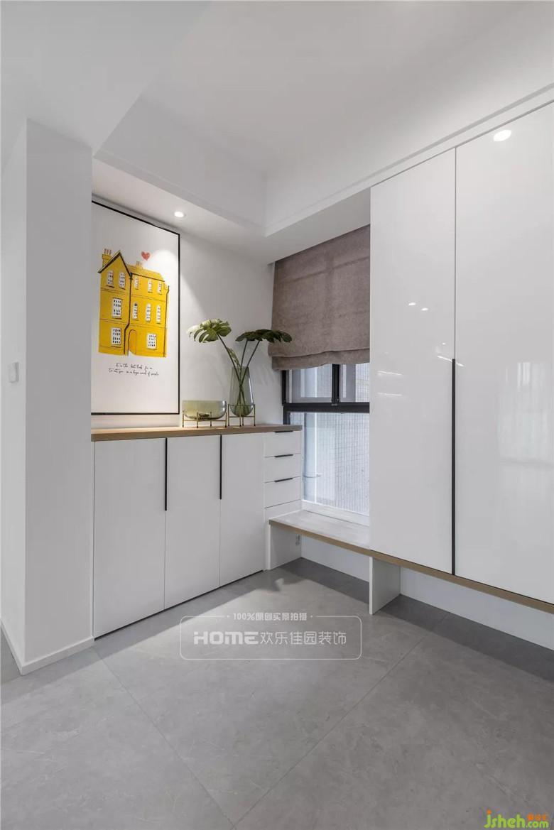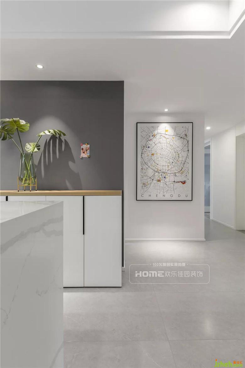 改变原始入户玄关的布局,在进门正对墙面的位置设计了半高鞋柜,在增加鞋柜储物的同时,又达到了装饰的作用。业主可以在半高的柜体上放置装饰品和绿植,使得玄关空间更加灵动和实用。