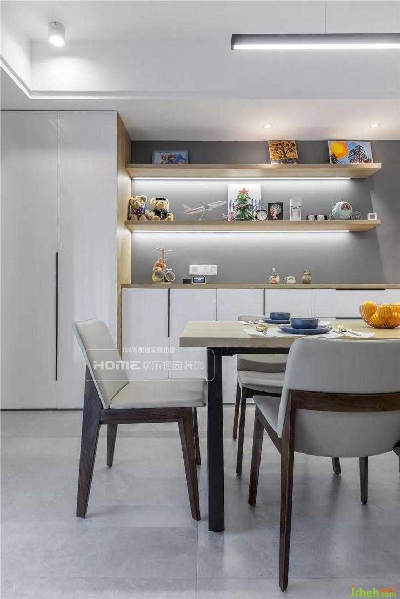 餐厅的墙面深灰色乳胶漆打底,再利用两块隔板打造成好物陈列区,原本光秃秃的墙面也有无限的可能,从各地淘回来的杯盘碟碗,旅行纪念品,照片、小型绿植都可以展示出来,高低错落、相映成趣。
