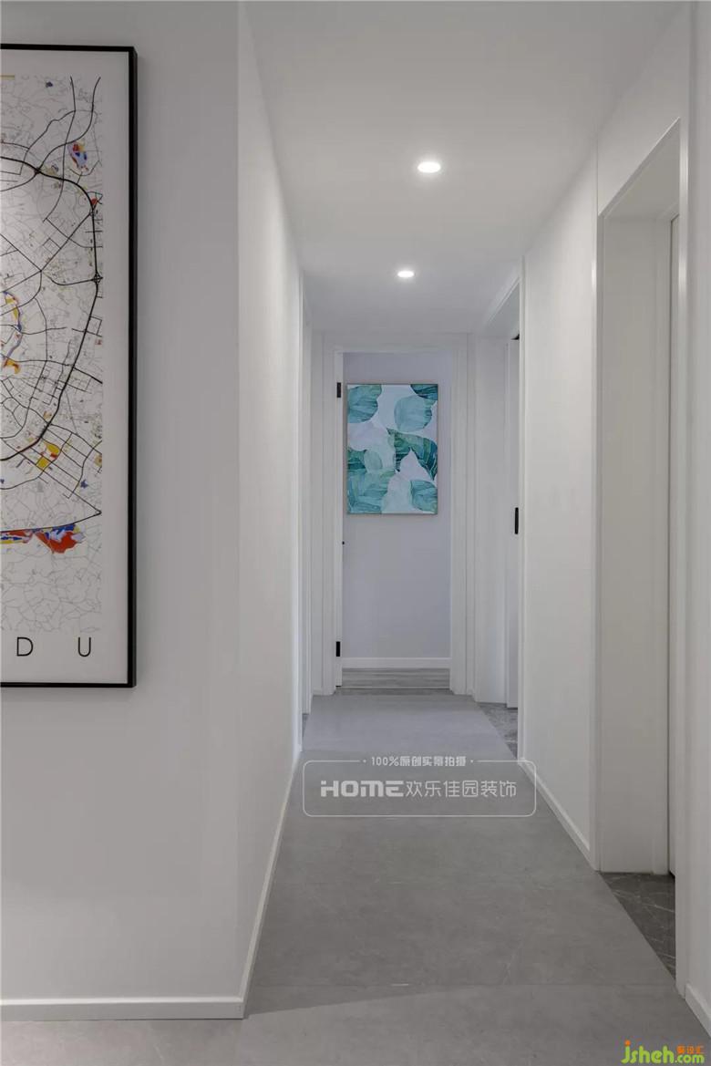 原房客厅到房间走廊区域狭长,进出不方便,设计师在设计时考虑了这点,于是把客厅到走廊的第一个房间的门往后退,让原本走廊的一部分面积与客餐厅融合到一起,形成了入房间的缓冲区域,合理的交通动线,大大提高了业主的使用效率和感受。