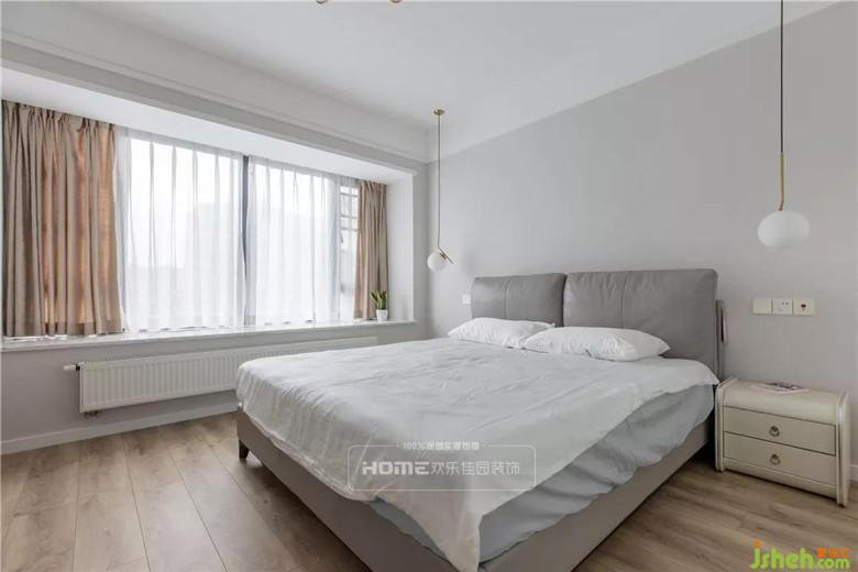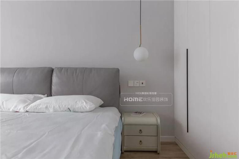 卧室走的是高冷现代风,大面积白色乳胶漆墙面配上木地板,低饱和度的色彩拼接到一起,丰富空间层次感。