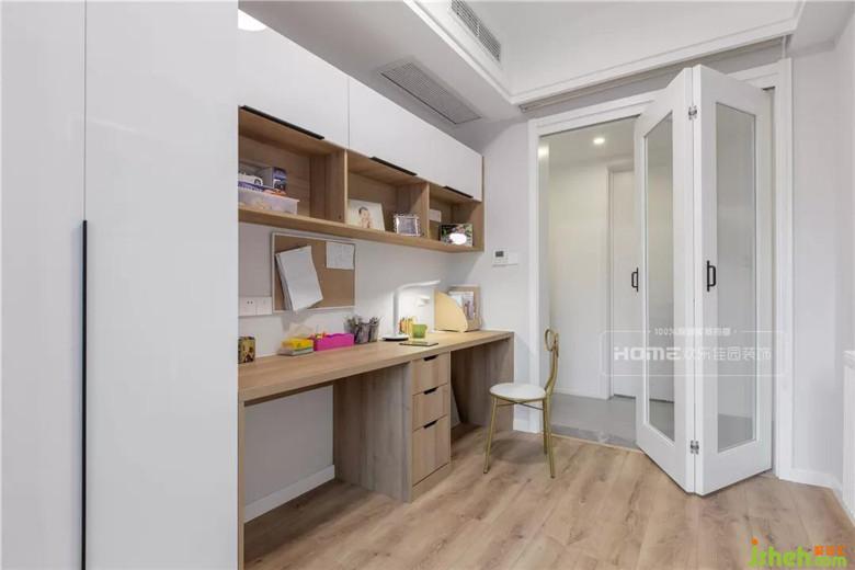 集办公、收纳储物、孩子玩耍一体的多功能房,温柔的灯光打在白色墙面上,为空间添上一抹暖色;折叠门的设计,使得过道空间显得不那么拥挤,不仅不占用地方,人进出也很便利。