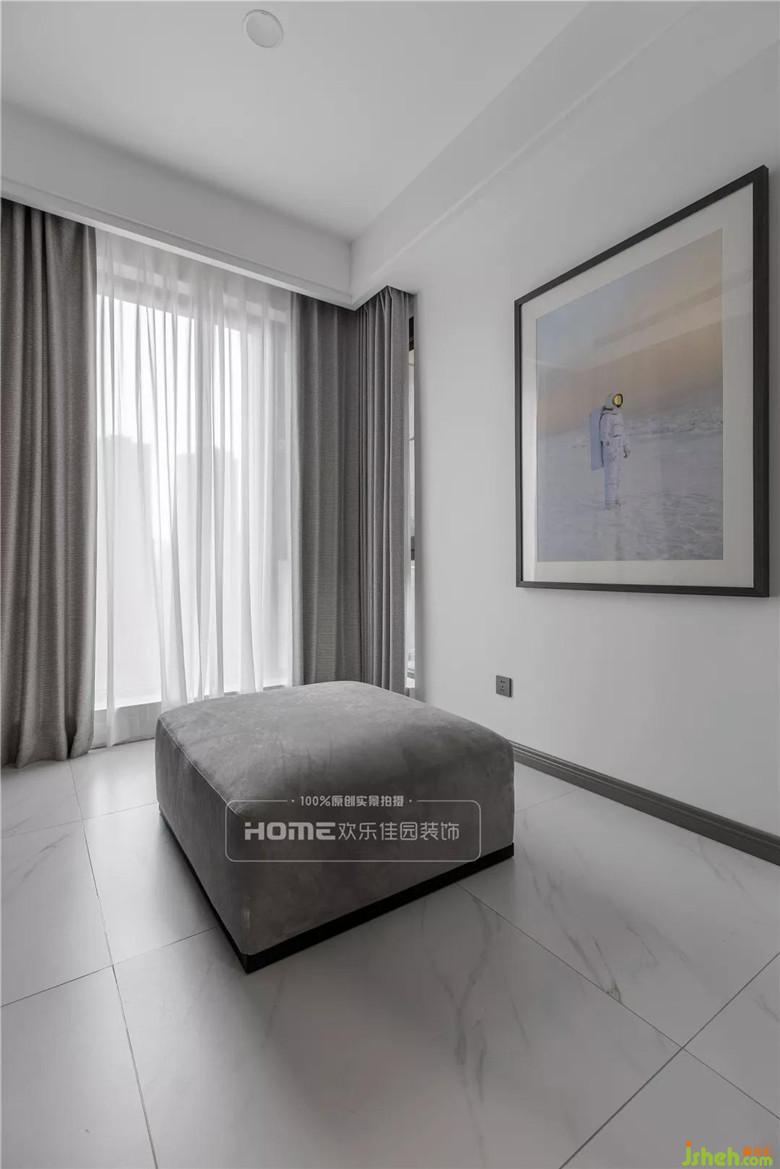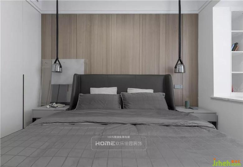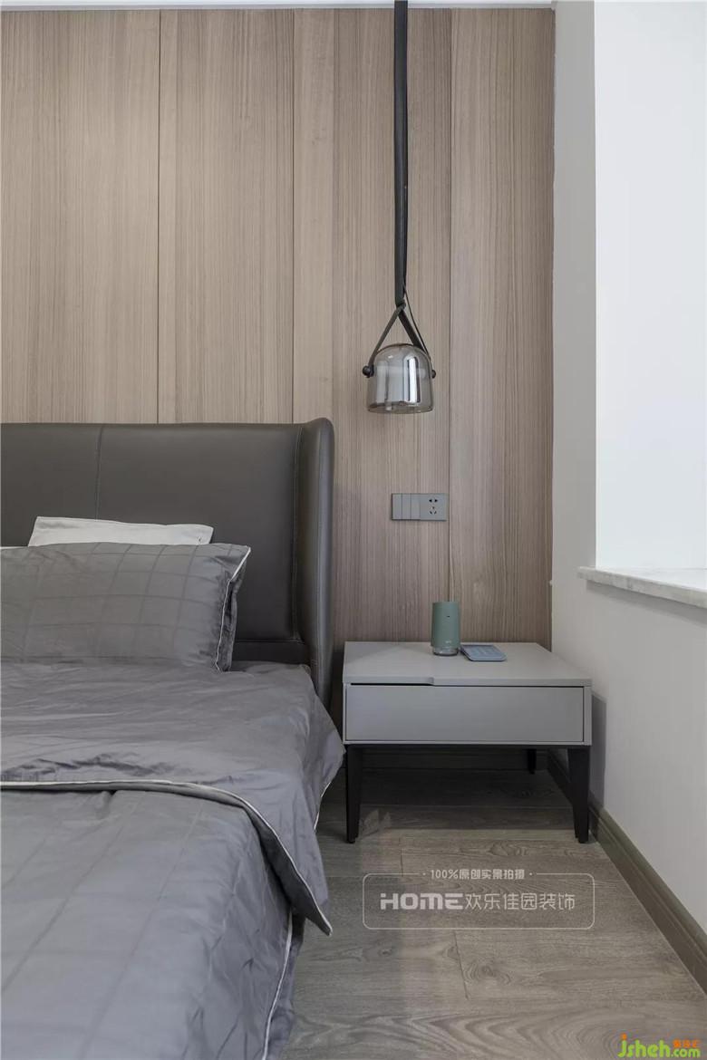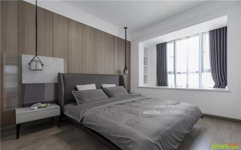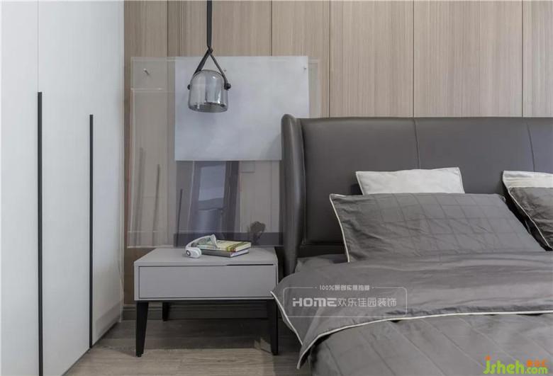 本案的一大亮点设计便是全屋无主灯设计,因此卧室在灯光的选择上利用床头两个吊灯制造氛围,提供最基本的照明需求。在床的周围预留充足的走动空间,避免过窄带来的磕碰,在飘窗的区域做了壁龛,既可装饰墙面又可以盛放生活中的小精彩。