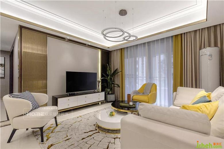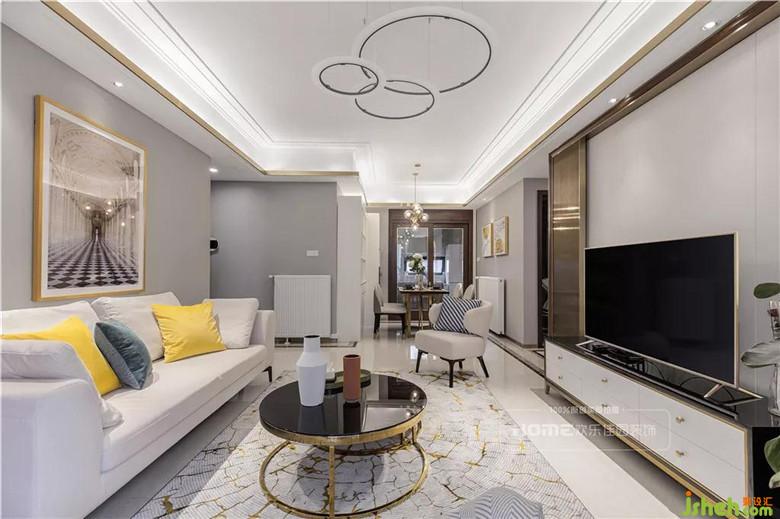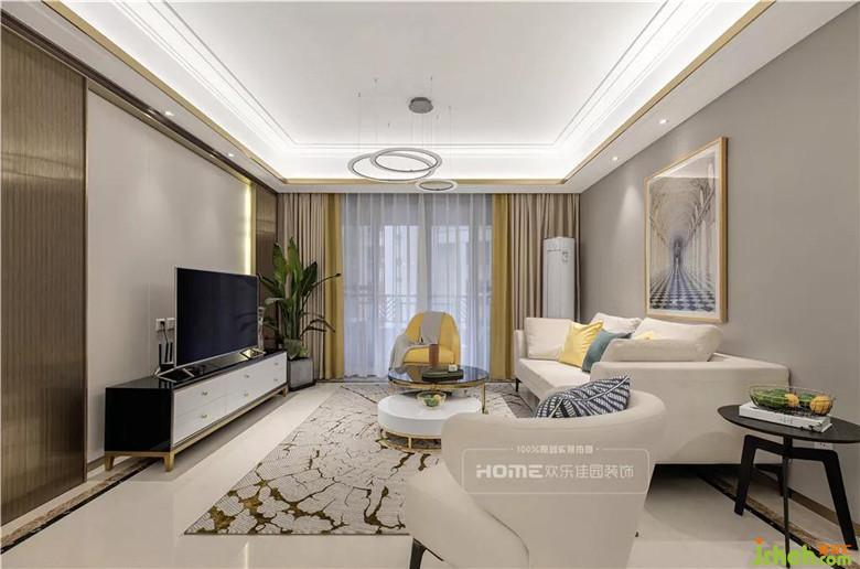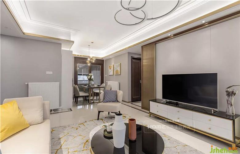 金属线条和大理石是打造轻奢感的最佳利器,爵士白的地砖,现代感的吊灯,相映成趣,米白色的布艺沙发与金属搭配活跃空间,现代的气息、轻奢的尺度把握得恰到好处...