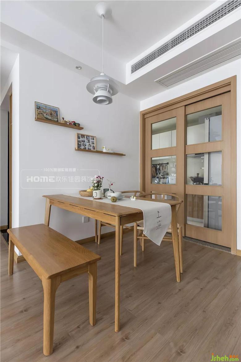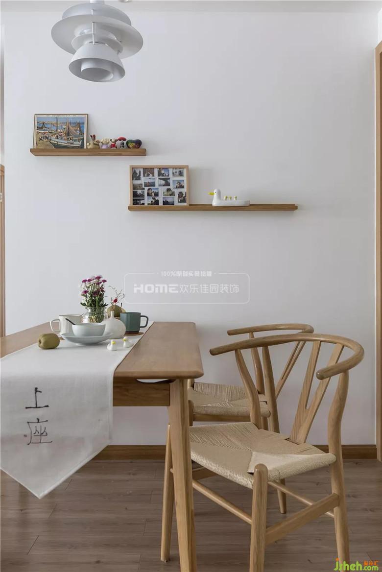 一盏吊灯保证基础的照明,白色的灯,木色的餐桌椅,同色系的隔板,摆上照片合集、装饰摆件,别致的温暖,让家回归烟火气息。