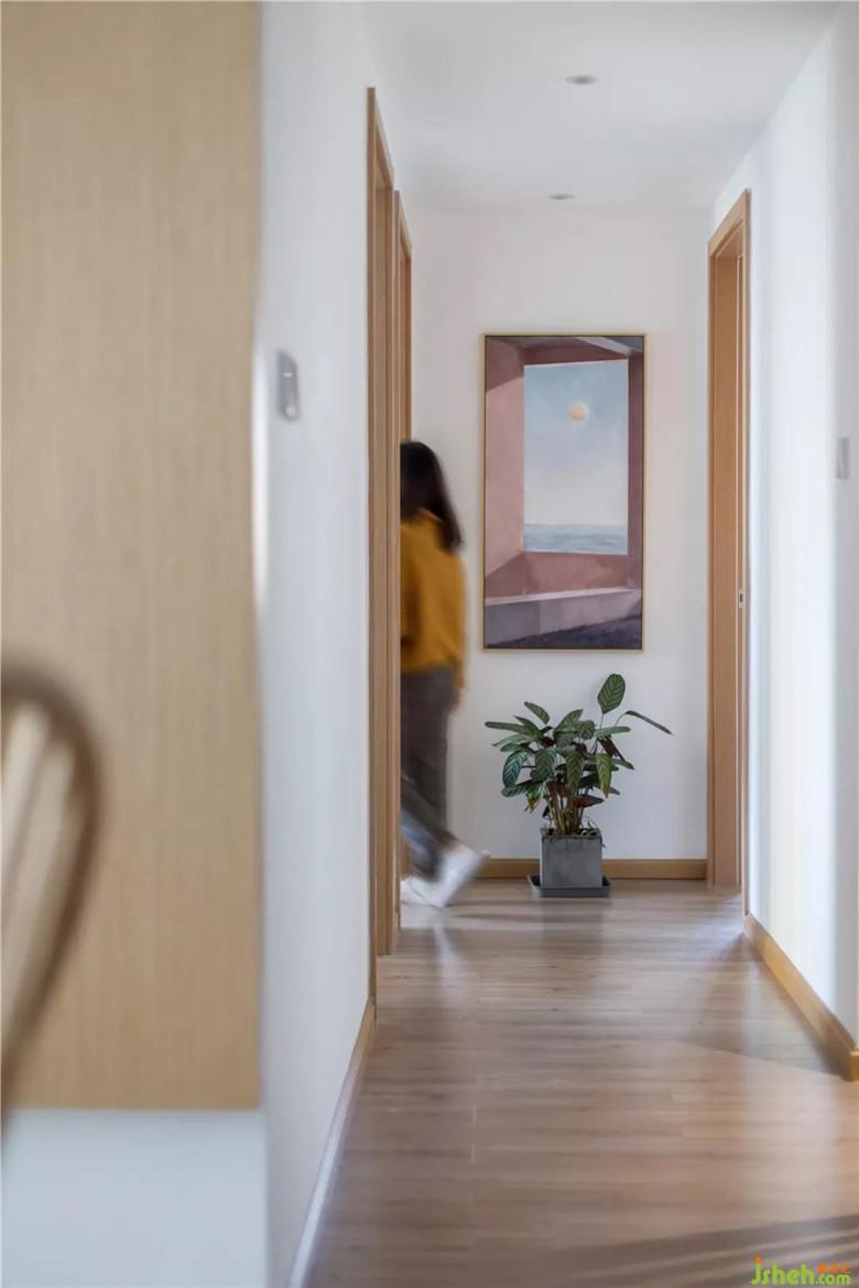 走廊是经常出入的地方,两边的大白墙是为了凸出尽头的壁画,再添置一盆绿植,文艺满满,充分利用走廊空间来设计,不仅能带来视觉上的吸引力,还满足小户型的实际需求。