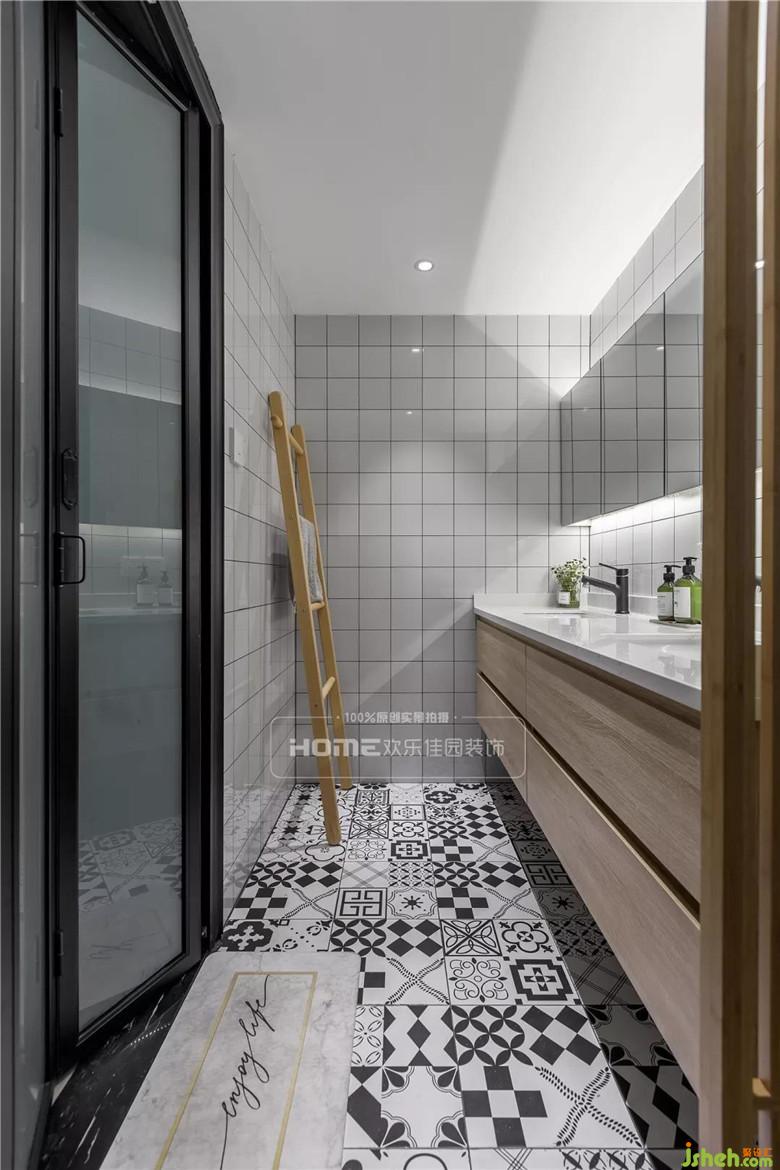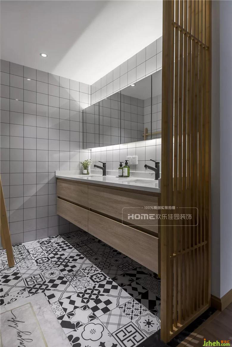 原房两个卫生间是紧挨着的,打通其中一个卫生间的隔墙,划分为独立的洗漱区域,用复古的白砖与不规则图案的花砖铺贴墙面与地面,竹制的镂空隔断,半透明的效果,给空间增添一丝清幽感。