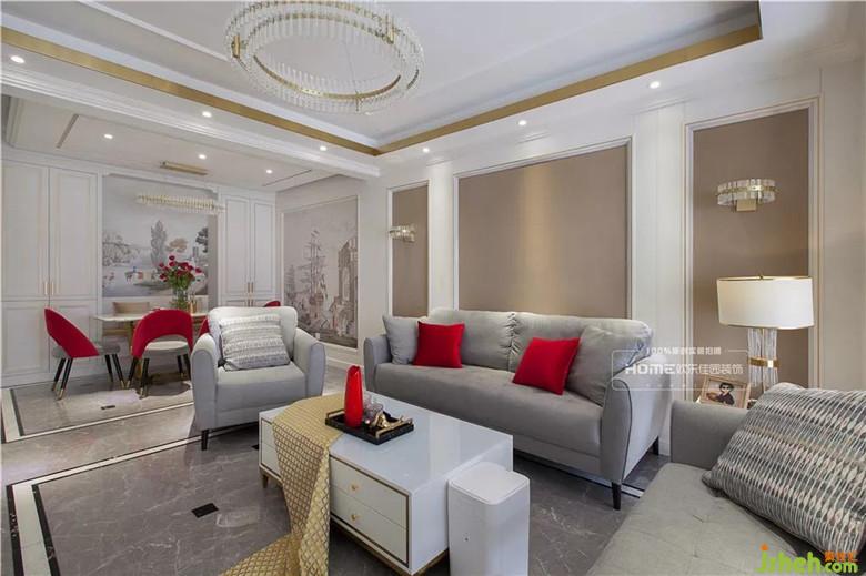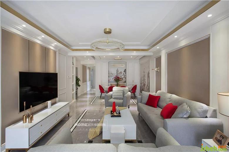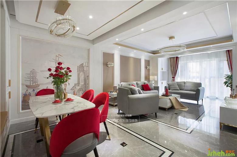 三口之家,女主人独爱大红色,男主人喜爱金色,所以整体装修是以大红色搭配金色的法式轻奢风格;装修公司空间并没有大面积使用红色和金色,大面的白色凸显金色的精致时尚,灰色与红色一冷一暖对比,营造惊艳空间。