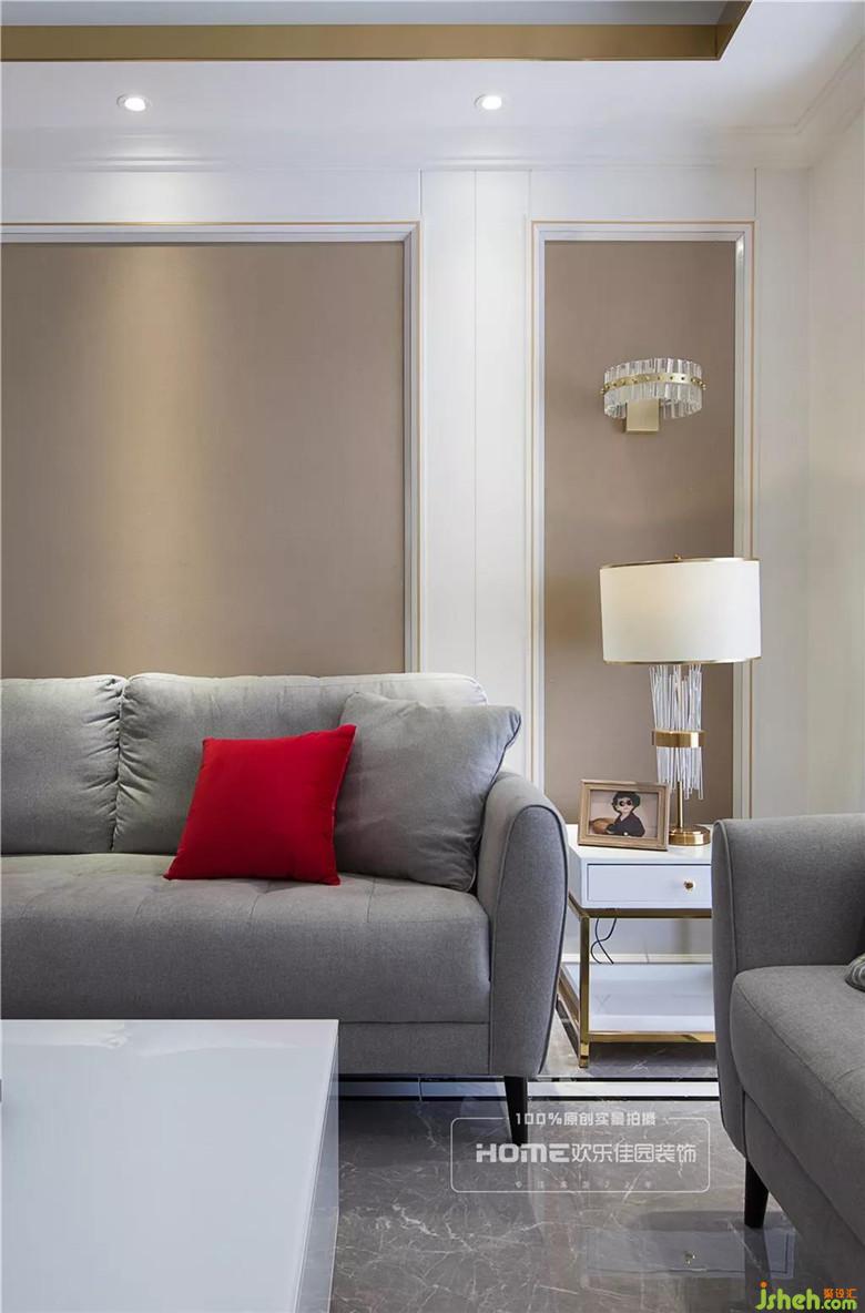除了色彩上的表现力,材质的使用上也完全满足风格该有的气质,灰色的沙发和大理石奠定沉稳基调;背景墙是白色墙板和质感细腻的金色墙布的组合,金色元素勾勒,呈现精致时尚的轻奢空间。