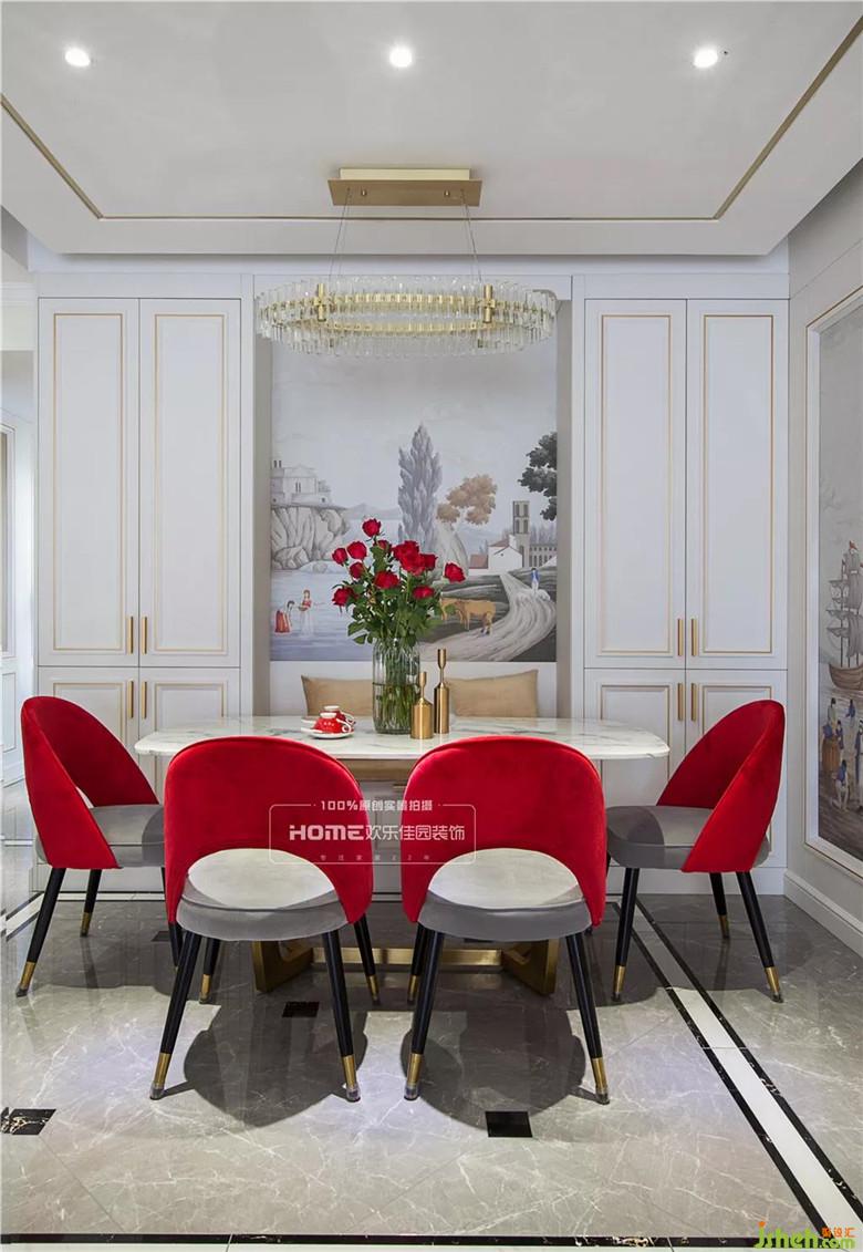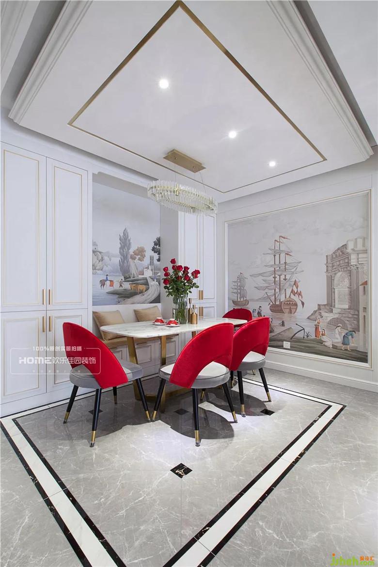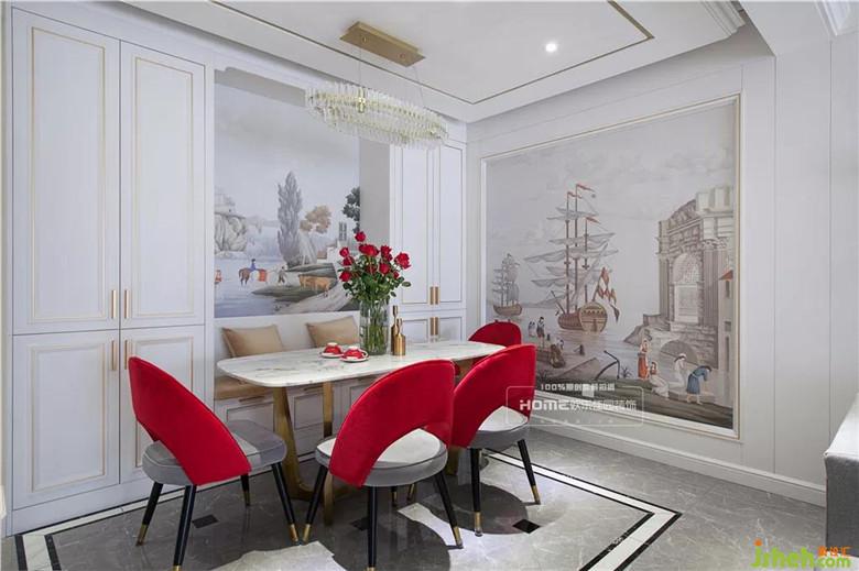 餐厅是卡座的形式,大面的白色用红色餐椅点缀,墙面上是异域风格墙画,用餐氛围时尚活跃,是一家人交流的好地方。