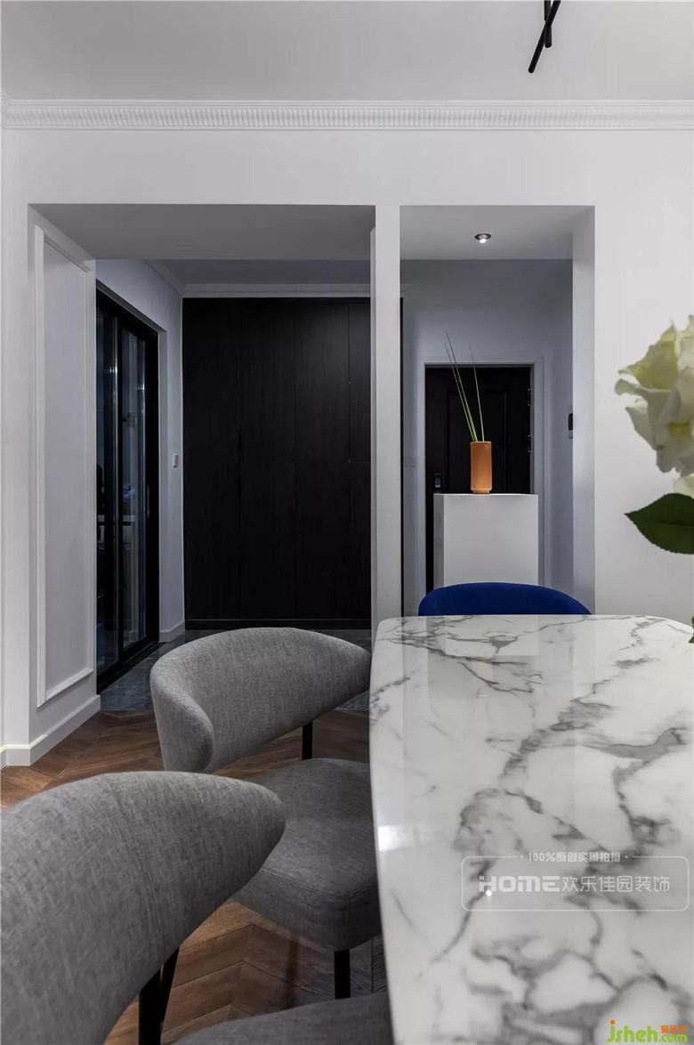 门套加宽延伸,由原24公分加宽到80公分,以拱廊的形式,将入户和餐厅完美分割,拱廊的设计最有趣的部分是,两侧运用石膏线条勾勒出空间韵味,强有力的艺术表现,像是走进一个宫殿,脚下的水磨石地板映着温柔的灯光,在微微晃荡中营造出进门的仪式感...