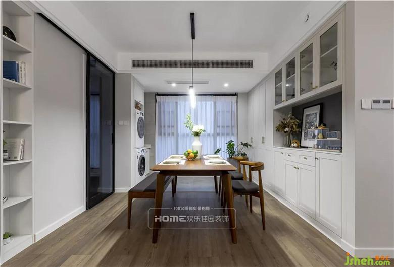 把生活阳台打开和餐厅空间融为一体,保留生活阳台的洗衣功能,在另一侧设计一排通顶柜,连接餐边柜,使得空间更为紧凑有序。
