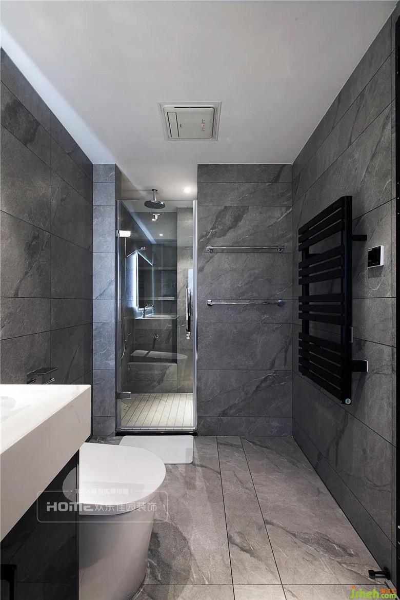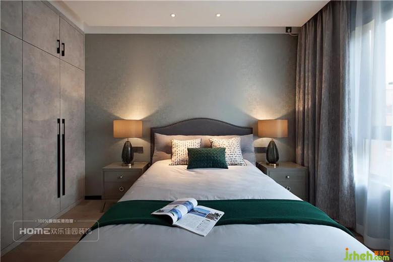 主卧室的设计非常出彩,从空间的结构到材质的颜色,处理都非常大胆,一面墨蓝色墙布与现代轻奢的家具形成较大的反差;铜质的线条、吊灯与暖灰色的墙板对比,呈现极佳的视觉冲击。一缕温暖的阳光穿透大大的落地窗射入主卧室,顿时让冷色装点的室内温馨倍增。