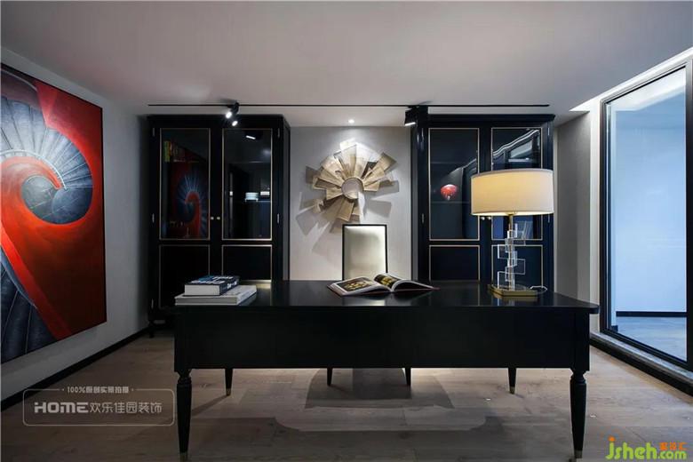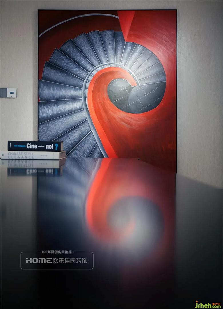 书房都是大面的处理,白色涂料的细腻与浅灰色墙纸的粗糙,有对比,有融合。黑色的家具在点光源的照射下更显高级。业主亲笔的巨型画作,让书房严肃的空间氛围,顿时热烈了起来。