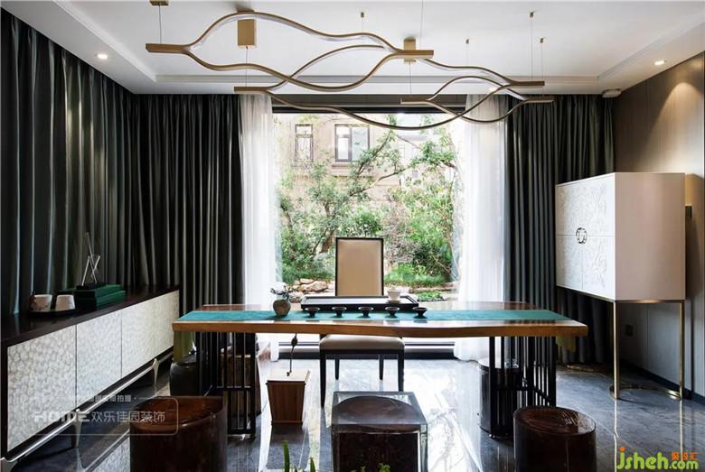 品茶区大尺寸的落地窗将户外花园的水景景观无限放大,外景与内景完美的融合,别有一番趣味。
