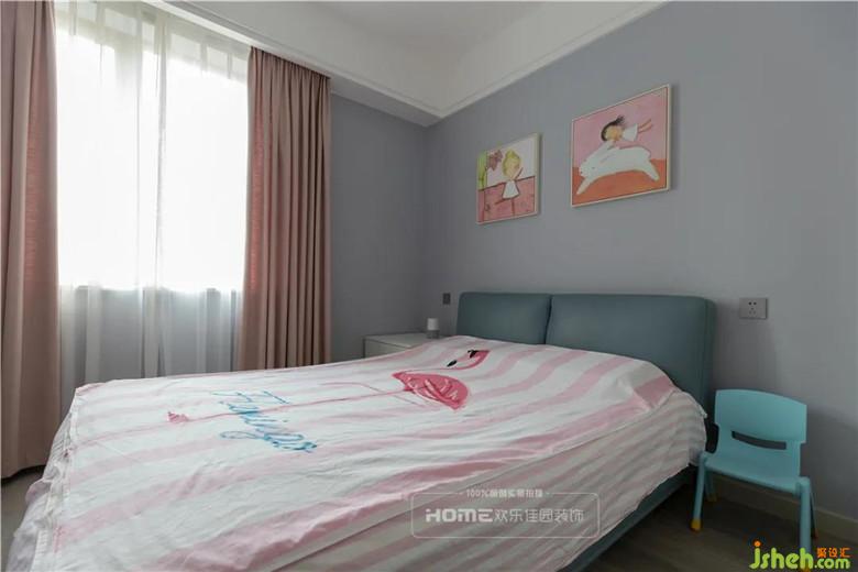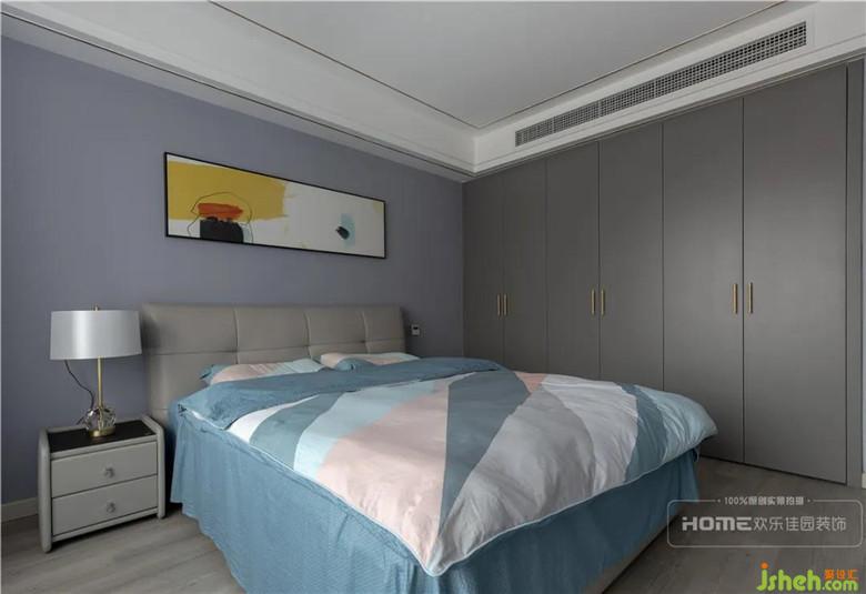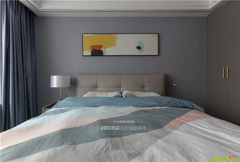 主卧的软饰和配色趋向于闲适与放松,低饱和度的中性灰,简单的几何图形和抽象挂画作为装饰,符合当下简约而不失品味的生活追求,呈现一派舒适悠闲的生活景象。