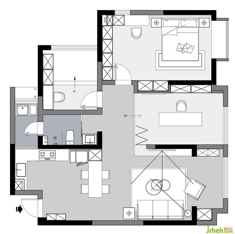 -厨房空间全部开放,与餐厅合二为一。将生活阳台的进出改到了卫生间。
