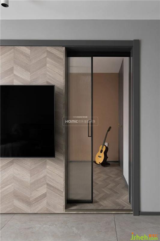 客厅与多功能活动室空间即相连又各为两个独立的空间,电视墙与多功能活动室的共用墙面采用鱼骨拼地板上墙,与隐藏的长虹玻璃门形成材质碰撞。