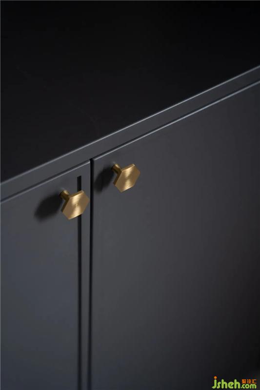 餐厅和客厅的分割带有一个收纳性极强的楼道空间,可以收纳一些大物件,比如高脚风扇、业主的乐器等。装修设计储物空间的橱柜门采用的是蓝灰色柜门搭配金色质感的拉手,与空间的整体色调融合为一体。