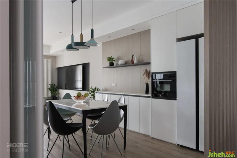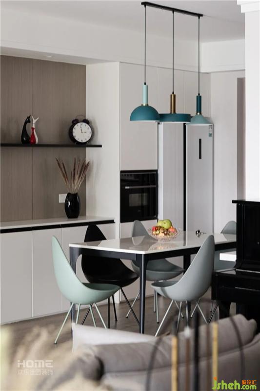 餐厅空间延伸了客厅的宽敞明亮,淡抹绿的餐椅映衬吊灯的颜色。家居设计丰富了空间色彩的层次感。设计师在餐厅增加了一组高柜加操作台,满足客户的烹饪需求。