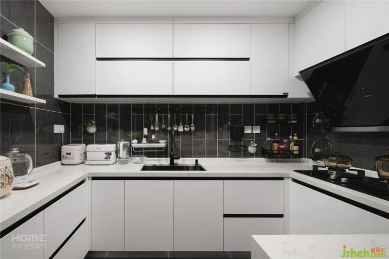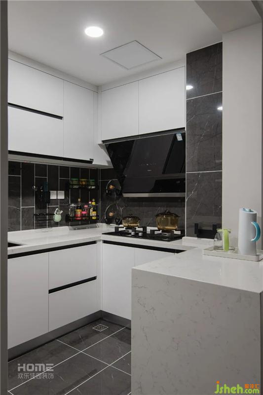 厨房的采光不好,设计师将门取消,做成敞开式厨房,让整个空间开阔起来。