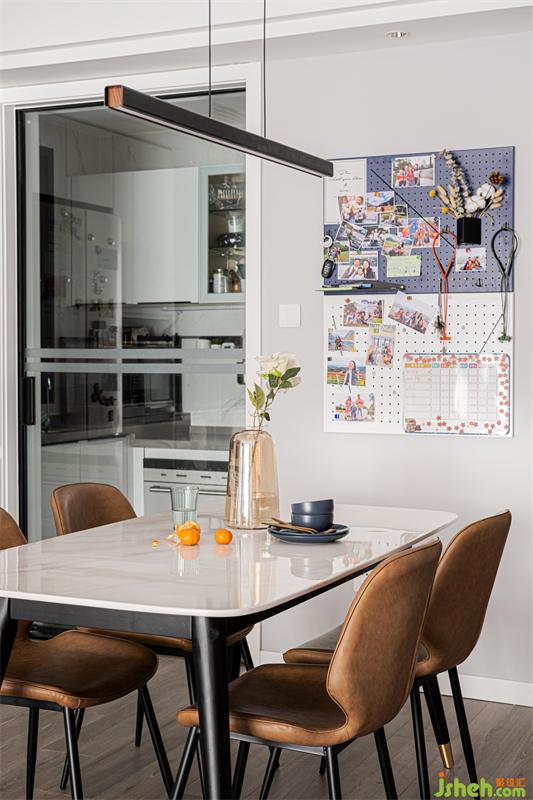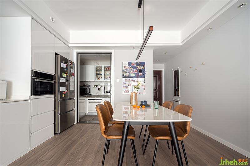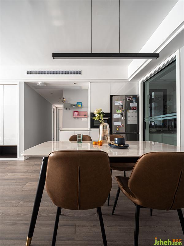餐厅里面的餐边柜与电器柜整体处理,相互融合为一体,很大的使空间整体性及利用率都极大的提升。