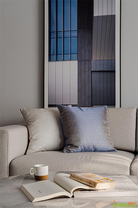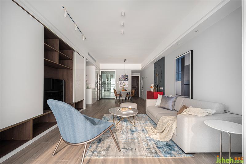 在家庭活动厅中将电视影藏在书柜内,不以电视为主体,形成亲子互动区或阅读空间,使区域功能更为的多元化。色彩上采用灰色,蓝灰色,白色做搭配,点缀红色,使空间层次更丰富。