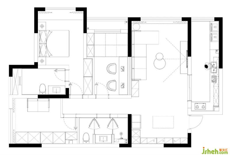 项目的户型改动不大,将原本衣帽间门调整到原有储物间位置,形成过道独立端景位置。其次将次卫生间做三分离卫生间,方便使用。