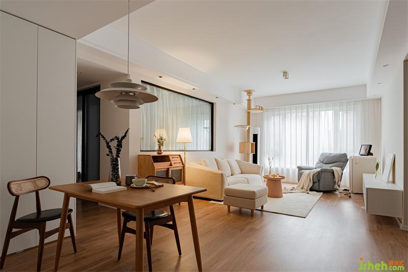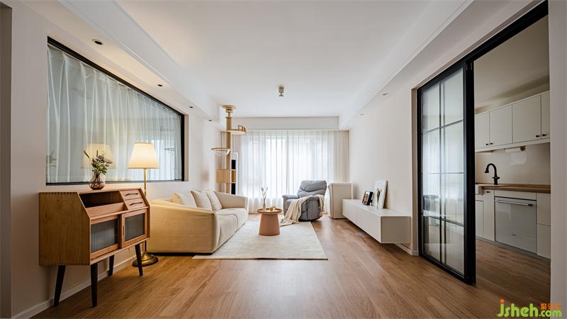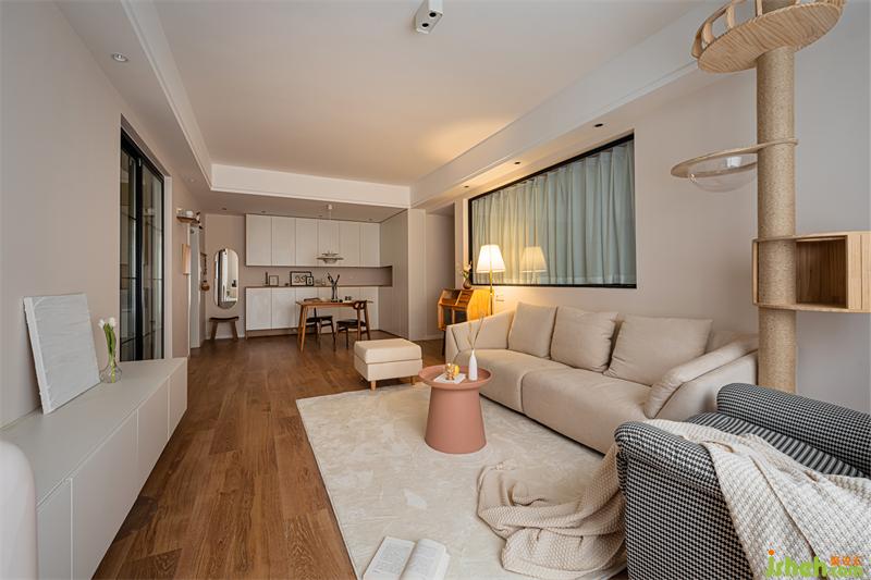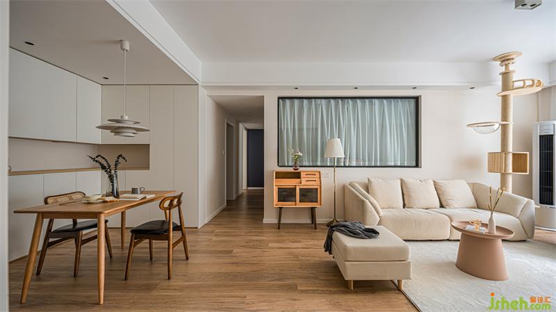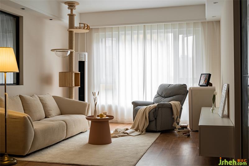 客厅整体色调采用奶白色搭配原木,营造出清新的空间感。原木猫架的设计,不仅让猫咪有了嬉戏玩耍的地方,也让整体空间延伸,增强视觉感。摒弃过度的华丽装饰,简洁的线条,温和的色调,安宁地诠释出静谧的格调。