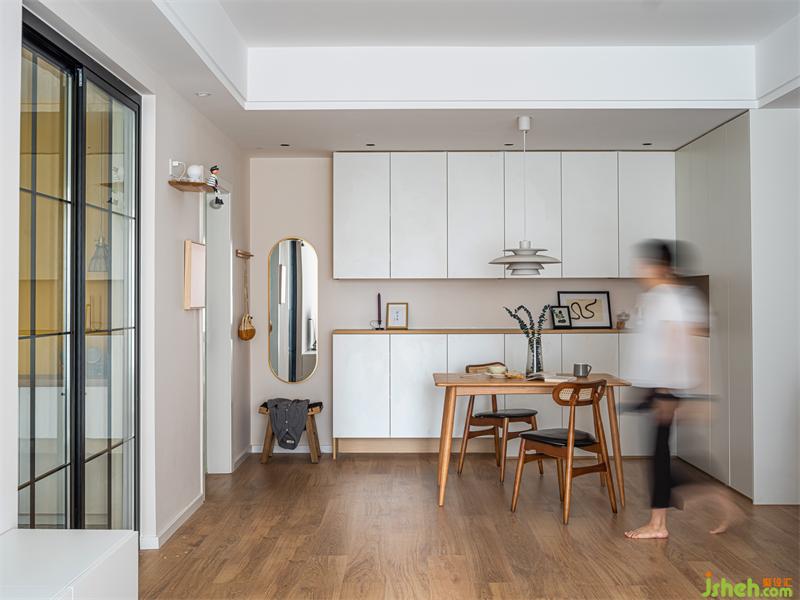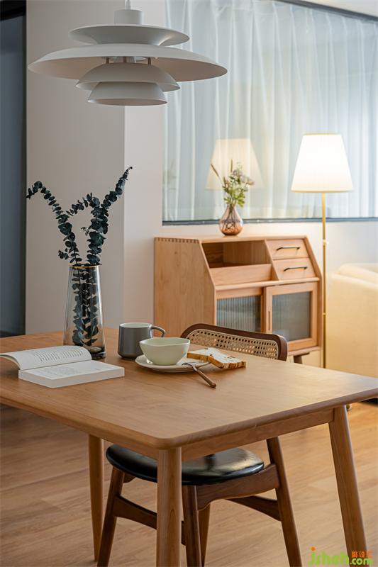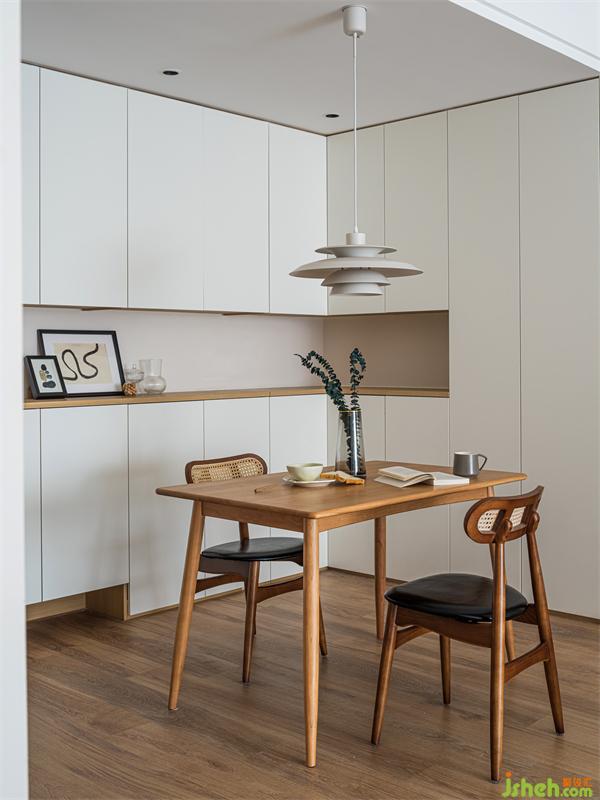 将入户储物柜以及餐边柜整体处理,增加空间整体性。原木餐座椅与原木零食柜相呼应,白色系的主色调让空间中的不同元素可以彼此连贯,材质、色系之间对应,释放家中的稳重恬静与平和。在这里就餐食欲一定会倍增!