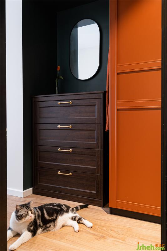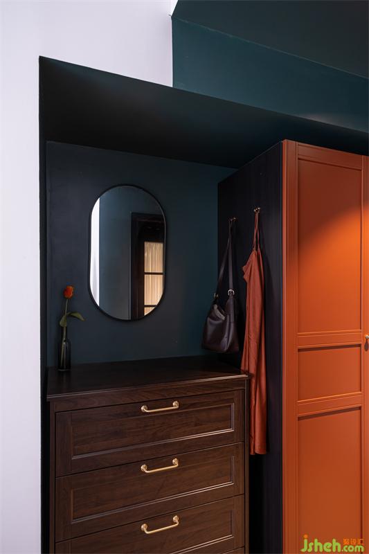 卧室中用赤红色的内嵌衣柜搭配深墨绿色的墙面,带着时代的印记而不沉闷。摒传统设计,在张力十足的线条勾勒、层次丰富的材质运用以及极具质感的装饰细节下,为居住者带来一种奢雅的生活享受。
