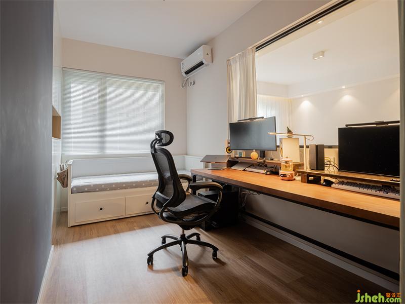 将书房与客厅中间的隔墙改为半高的透明玻璃隔断墙,让空间的互动性更强。透明的玻璃隔断墙主要目的是将光线收集,并柔和的释放到书房。增加空间采光的同时也让书房氛围灵动不沉闷!成为两个人独处空间,在这里工作效率也会提高很多倍吧!